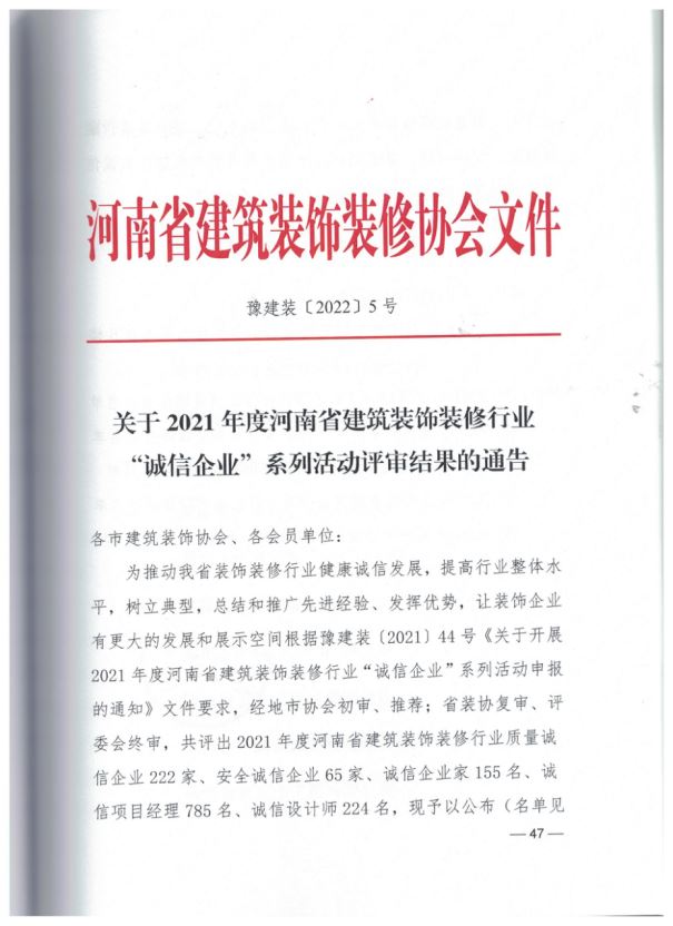 关于2021年度河南省建筑装饰装修行业“诚信企业”系列活动评审结果的通告