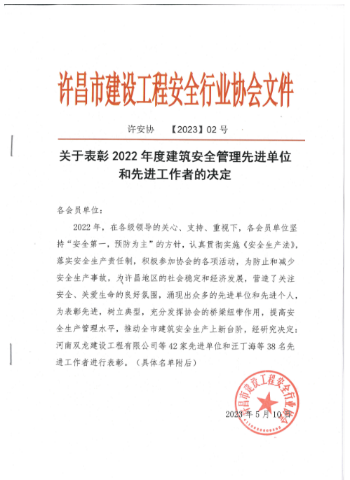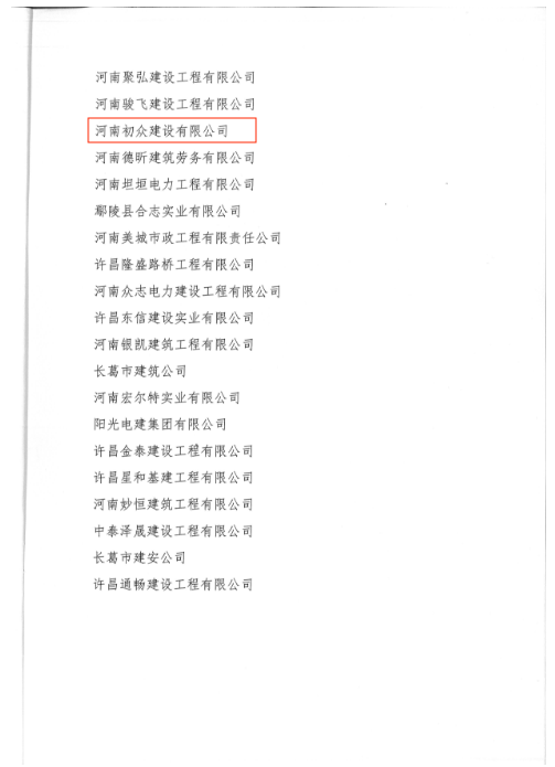 热烈祝贺河南初众建设有限公司荣获许昌市建设工程安全行业协会2022年度建筑安全管理先进单位!!!