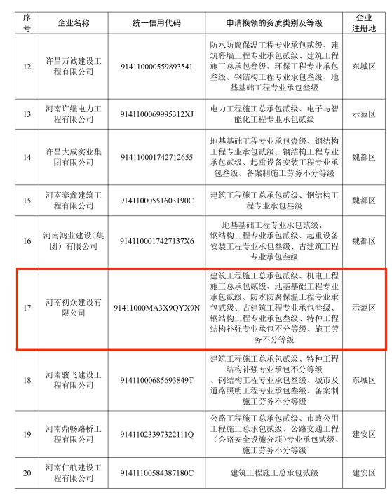 2.许昌市申请换领1年有效期资质证书的建设工程企业名单